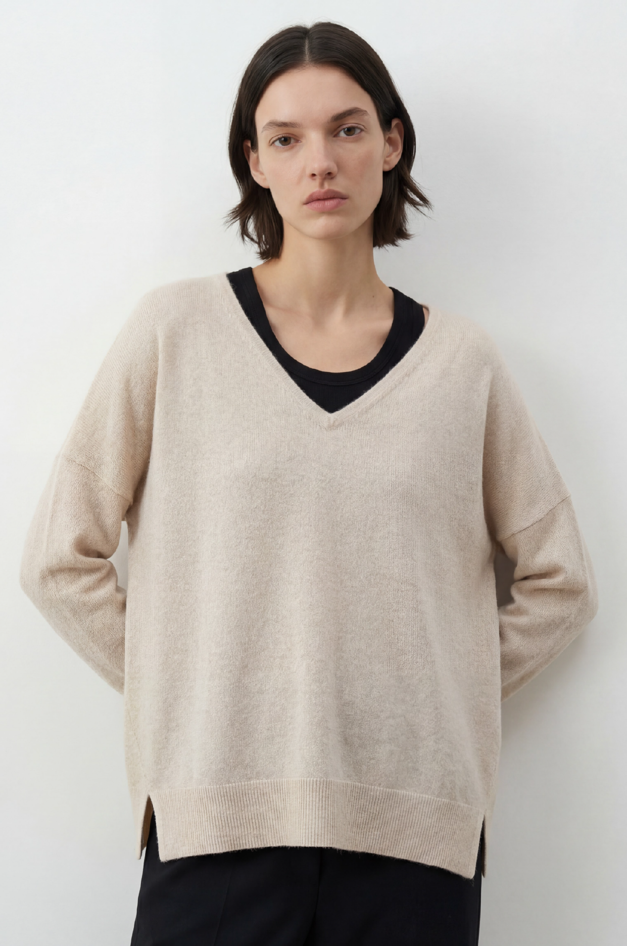 The ALEGER all-time favourite - this oversized long sleeve V-neck is crafted from ultra-soft cashmere and is the perfect piece for effortless layering. 100% Cashmere Deep V-neckline Ribbed trims at hem, cuffs, and neckline Subtle side openings Dropped shoulders Loose fit